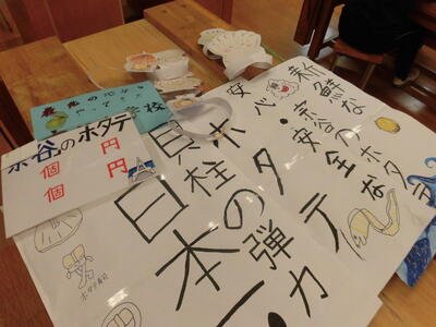子どもたちは、お客様に声かけをする係・オーダーをとる係・ホタテの殻を剥く係に分かれて販売をします。