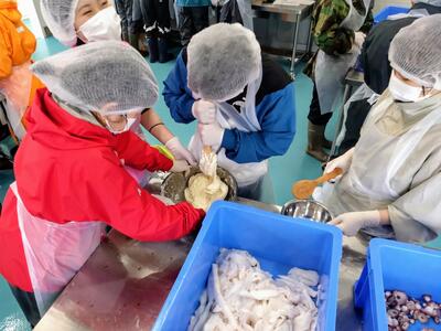 本日の5・6時間目に2年生を中心に全校でタコの燻製実習②を行いました。